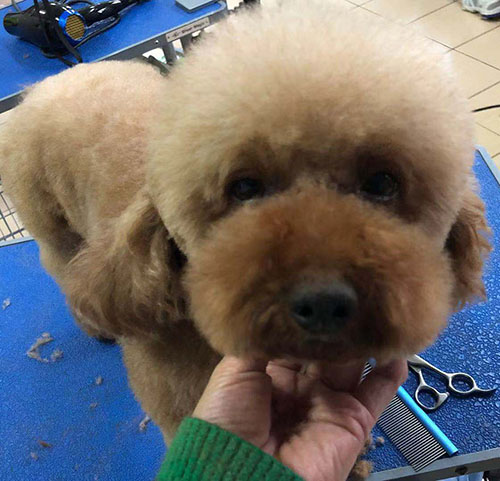 这只狗狗美容后给人感觉很乖巧,圆圆的脑袋,线条性很好,狗狗可能对自己的新造型还不是很适应,看起来有点呆呆的感觉。