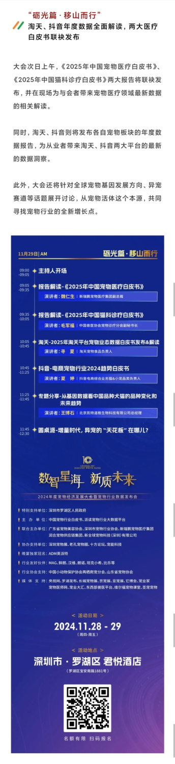 定了!2024年度宠物经济发展大会暨宠物行业数据发布会正式定档! 由中国宠物行业白皮书、派读宠物行业大数据平台主办的2024年度宠物经济发展大会暨宠物行业数据发布会正式定档11月28日-29日,宠物董事长阎金胜受邀出席会议。 更多>>