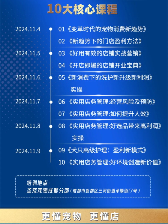 一场特训营升级百万门店,还有神秘嘉宾? 应广大加盟商热烈要求,新一期圣宠《百万门店经营特训营》落地成都,11月4日-11月9日,圣宠董事长阎金胜、总经理李安春率队亲赴成都并联合和颜沐语,带来新前沿的的经营理念和技术,为广大加盟商持续赋能。 更多>>